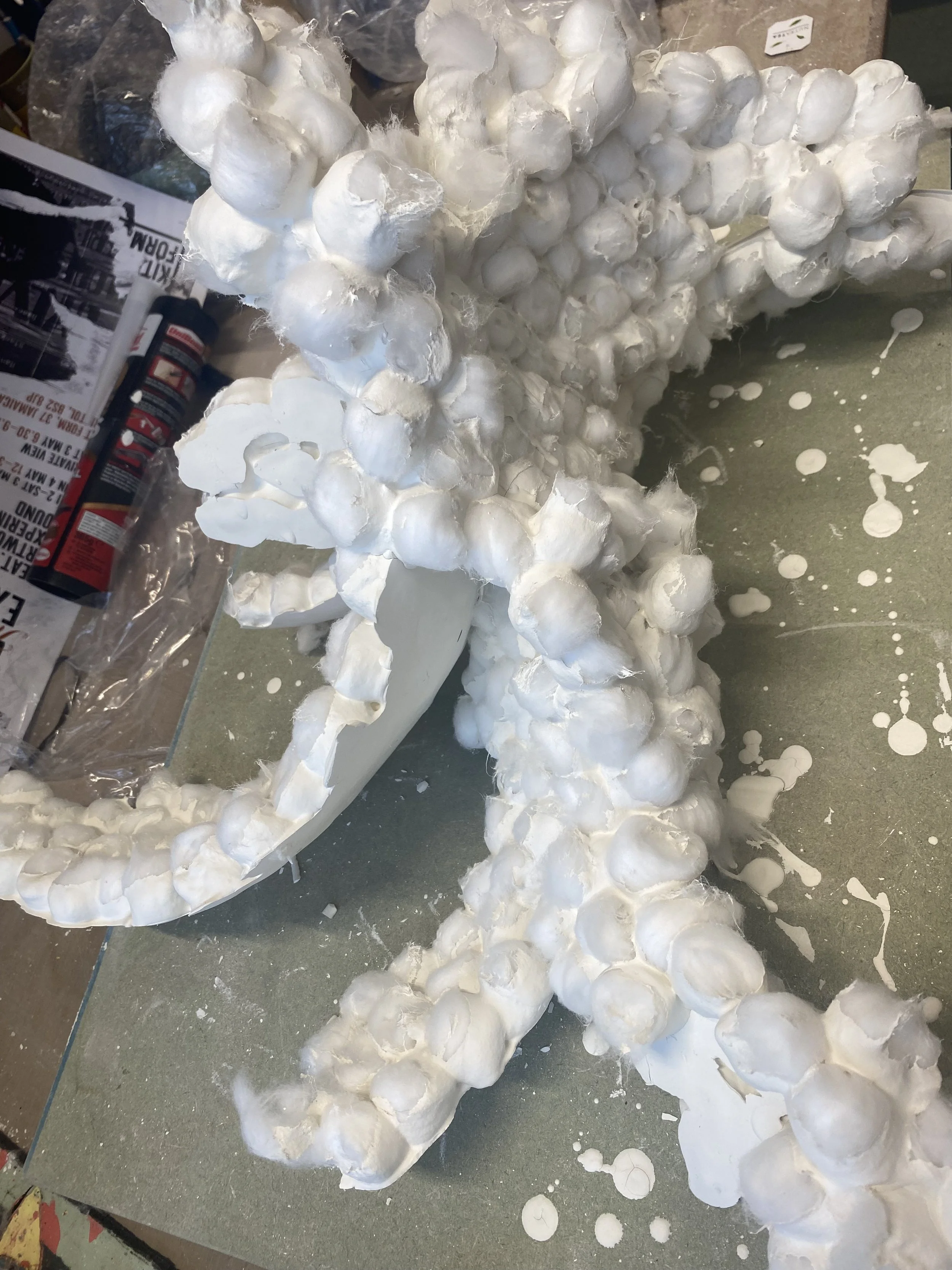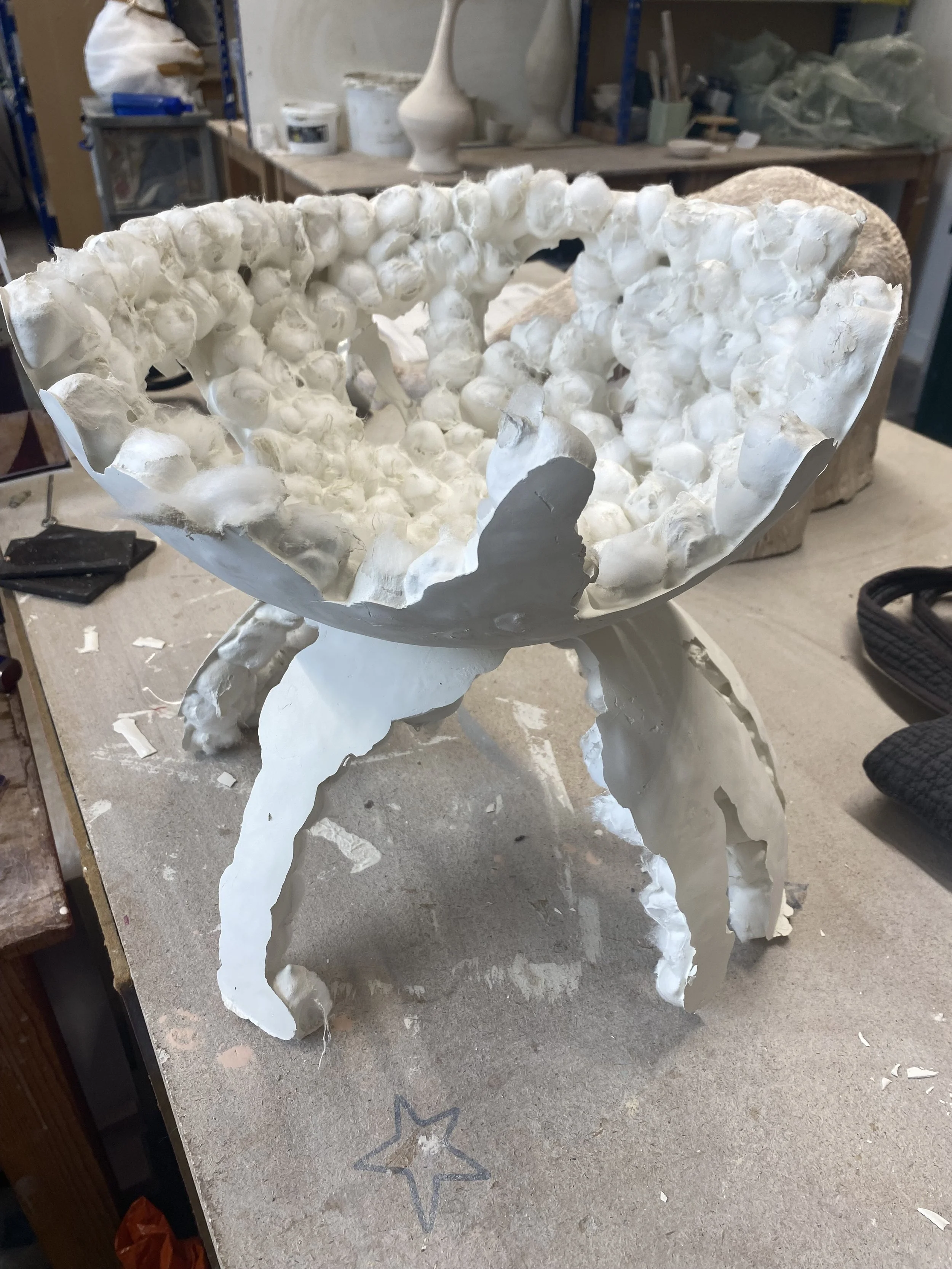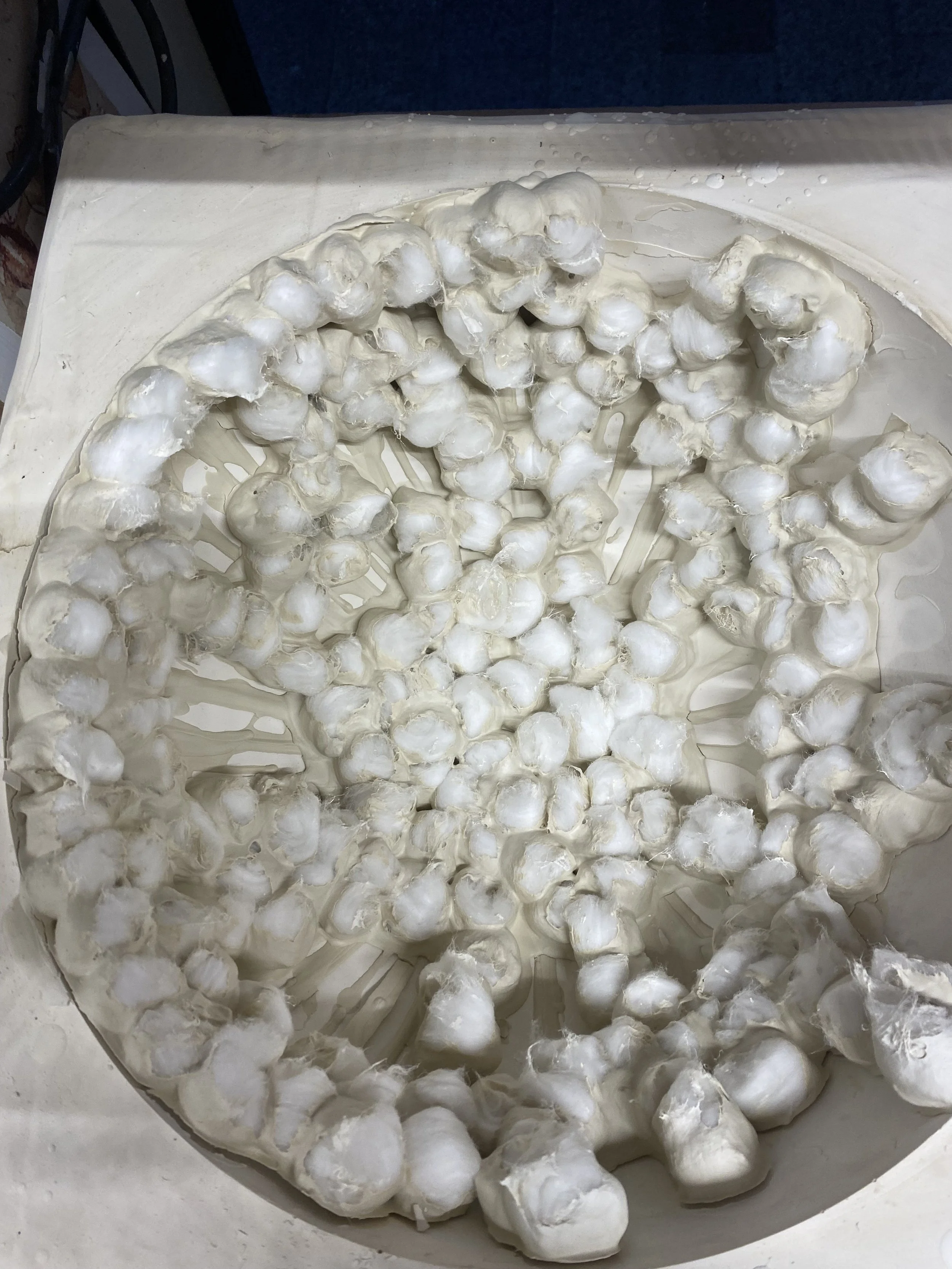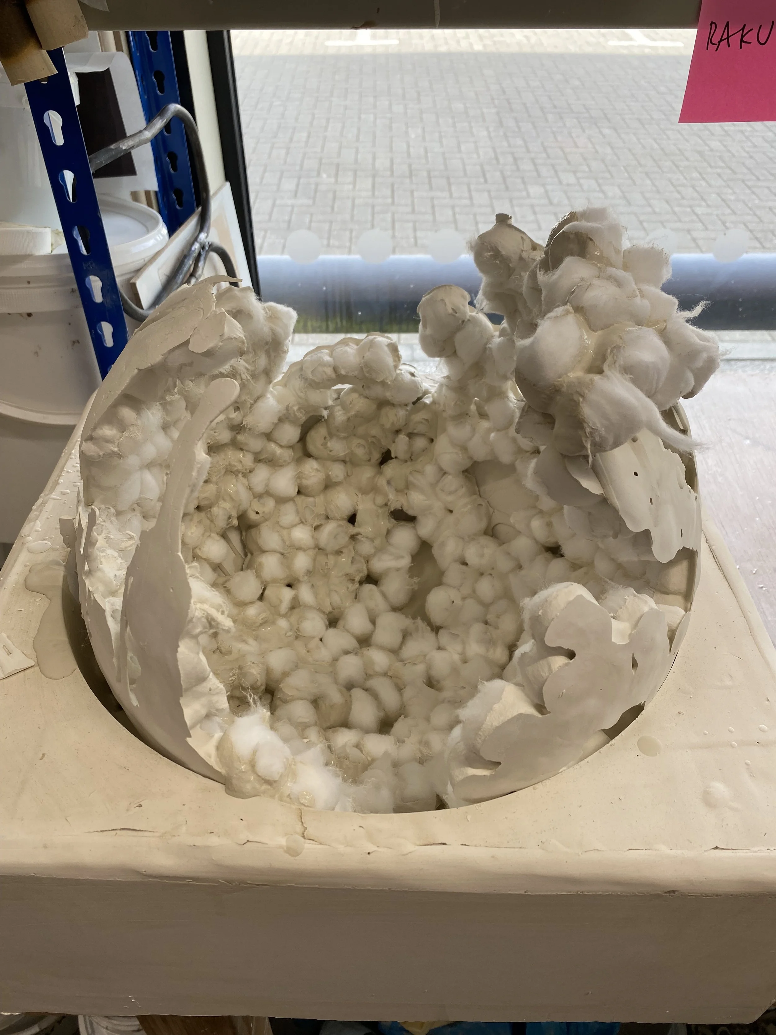 My porcelain pieces are birthed in a huge plaster mould. Slip coated cotton wool balls multiply in the shape and are left to dry, peeling themselves away from the plaster in the process. More slip is used to combine pieces before the sacrificial offering to the kiln. Porcelain has a beautiful way of curling during the firing process. The outcome is always a wonderful mystery